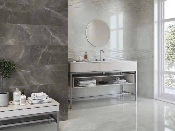 Kolekcja BAYONA to delikatna imitacja marmuru o rektyfikowanych krawędziach.
