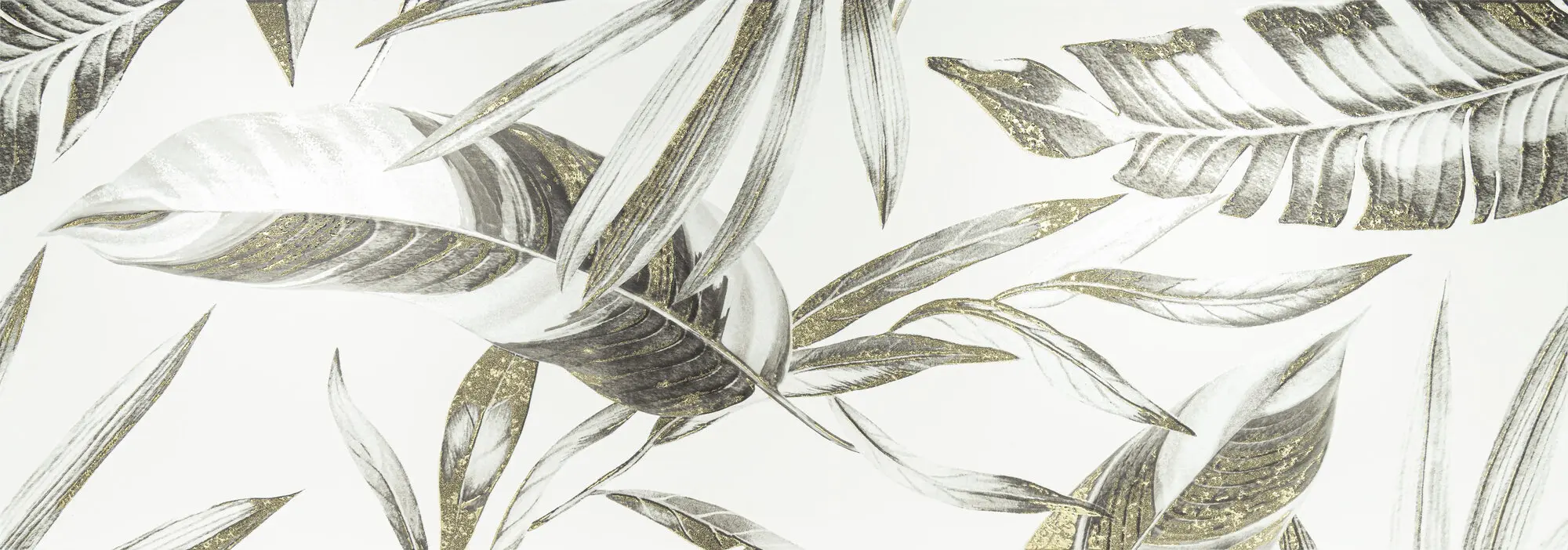 Dec. Albi Leaves Gold B to dekoracyjna płytka gresowa z matową powierzchnią, zdobiona wzorem liści w złotych i naturalnych odcieniach — wariant kompozycyjny płytki Gold A, tworzący spójny, wielopłytkowy dekor ścienny.