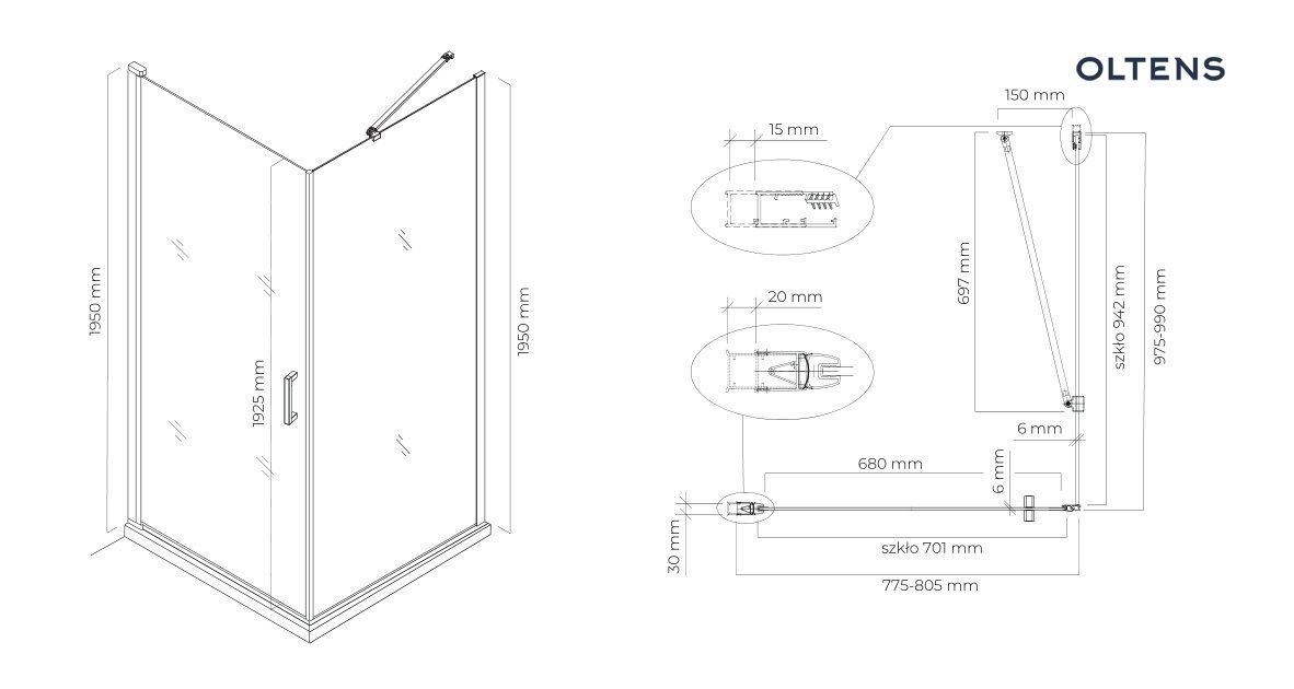 Oltens Rinnan kabina prysznicowa 80×100 cm prostokątna drzwi ze ścianką czarny mat/szkło przezroczyste 20215300