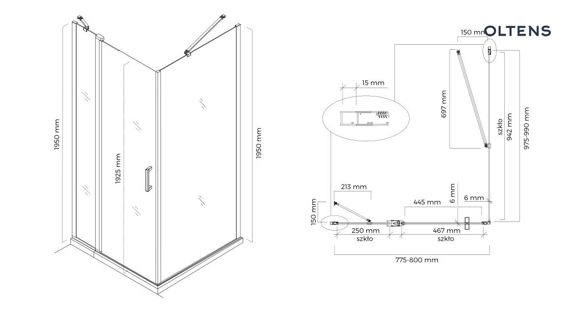Oltens Verdal kabina prysznicowa 80×100 cm prostokątna drzwi ze ścianką czarny mat/szkło przezroczyste 20206300