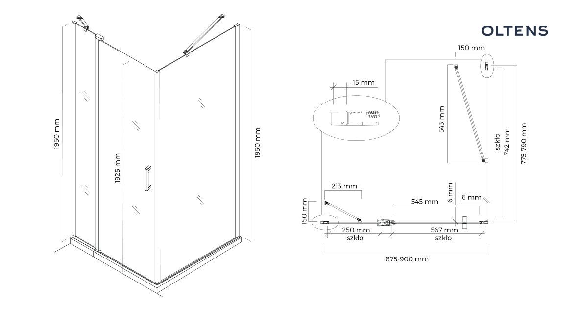 Oltens Verdal kabina prysznicowa 90×80 cm prostokątna drzwi ze ścianką czarny mat/szkło przezroczyste 20207300