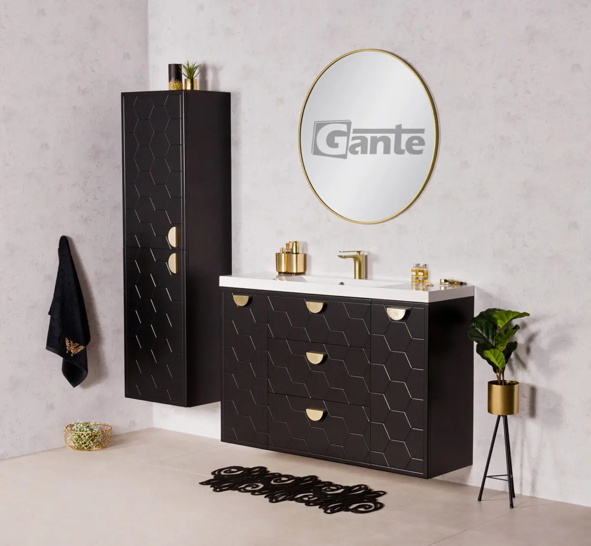 - Opis: Nowoczesna szafka łazienkowa w czarnym matowym kolorze, z białą dolomitową umywalką oraz czarnymi uchwytami. Posiada trzy pakowne szuflady z systemem cichego domykania. Wykonana z płyty MDF, pokryta folią meblową zabezpieczającą przed wilgocią. Charakterystyczne frezy w kształcie plastra miodu dodają szafce dynamizmu.