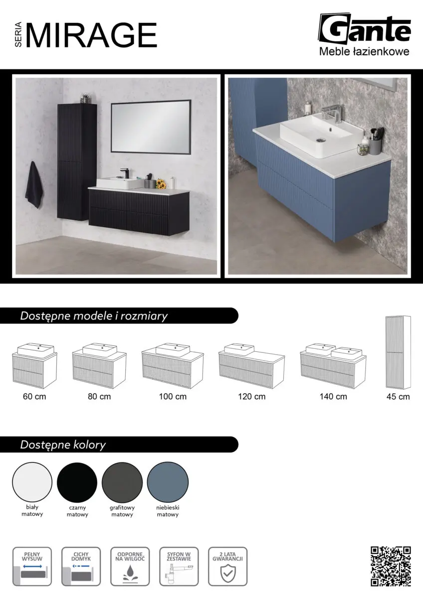 Opis Serii: Seria MIRAGE to nowoczesne i eleganckie meble łazienkowe w matowym, grafitowym wykończeniu z marmurkowym blatem, które wprowadzają do wnętrza luksusowy i minimalistyczny charakter. Charakterystyczne pionowe frezy na frontach dodają meblom subtelnego i nowoczesnego akcentu. Szafki z serii MIRAGE są funkcjonalne, dzięki zastosowaniu systemu cichego domykania, bezuchwytowego otwierania push to open i trwałych materiałów, takich jak laminowana folia meblowa na płycie MDF. Produkowane przez polskiego producenta GREKON i firmowane marką GANTE, meble MIRAGE są idealnym wyborem dla nowoczesnych i stylowych łazienek.
