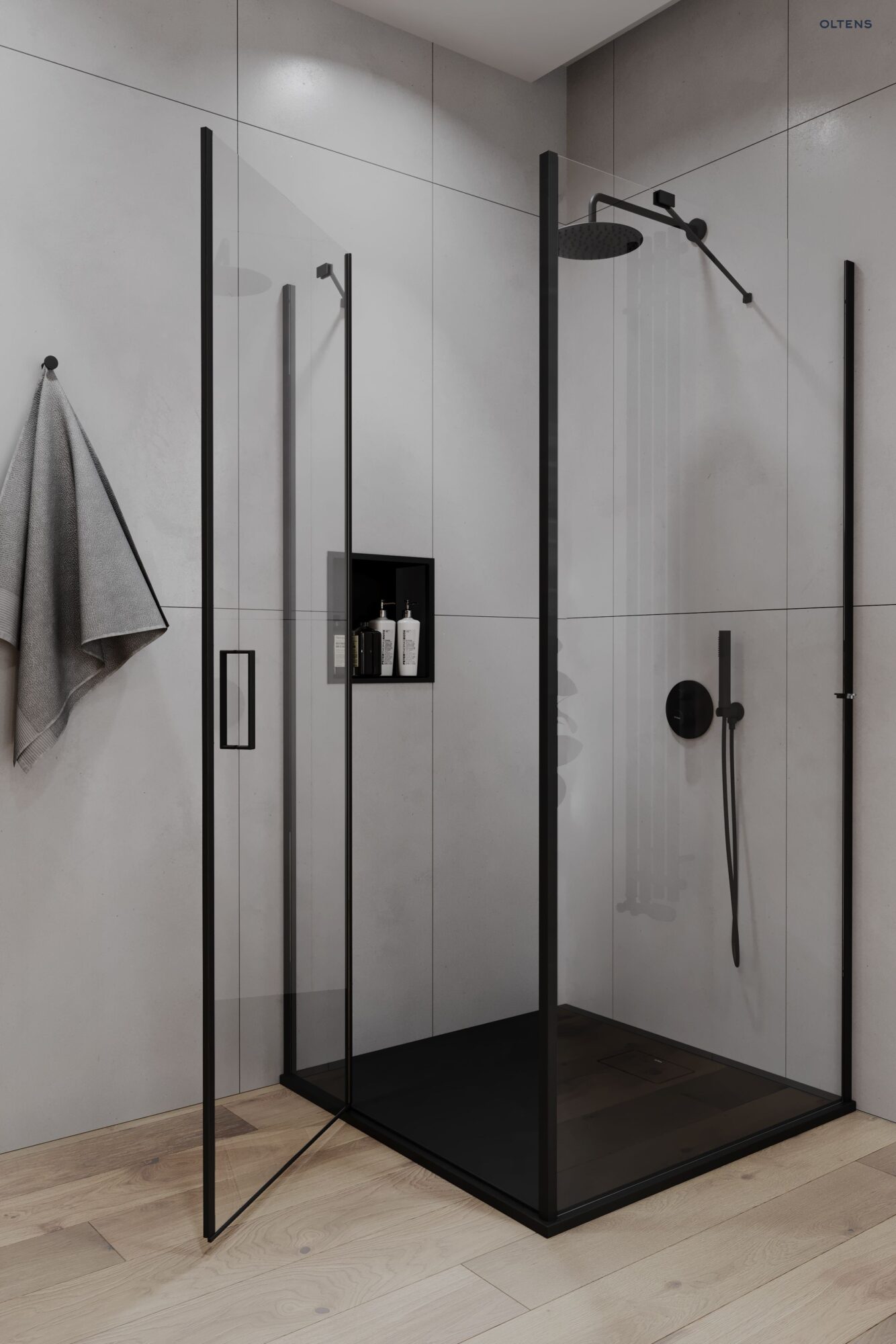 Zestaw Oltens Hamnes bateria podtynkowa z deszczownicą 30 cm Vindel i kompletem prysznicowym Ume czarny mat 36607300