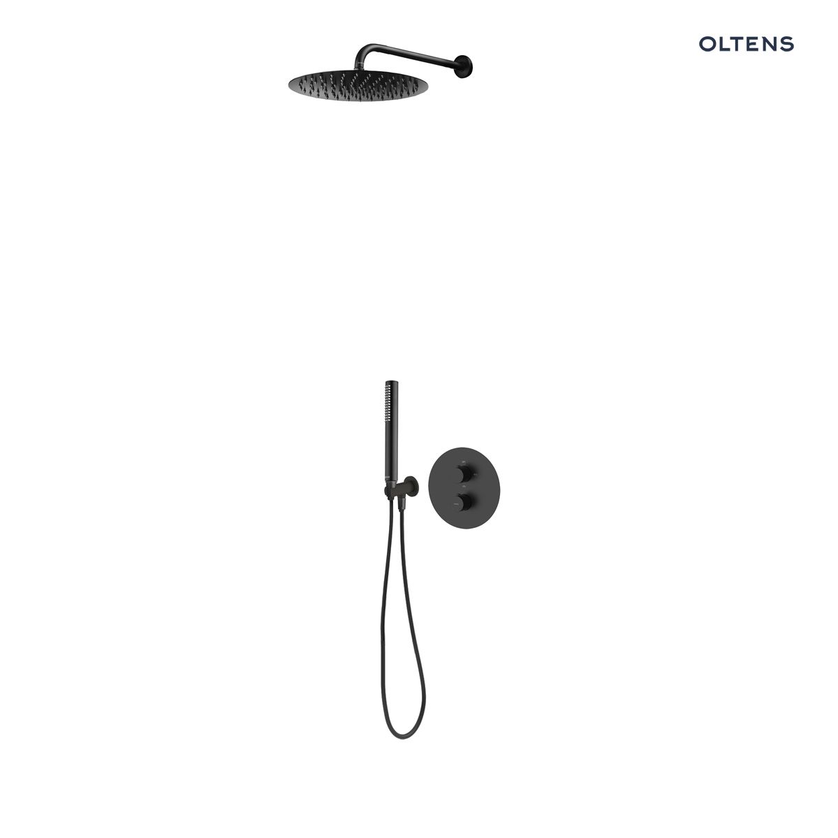 Zestaw Oltens Katla bateria podtynkowa termostatyczna z deszczownicą 30 cm Vindel i kompletem prysznicowym Ume czarny mat 36608300